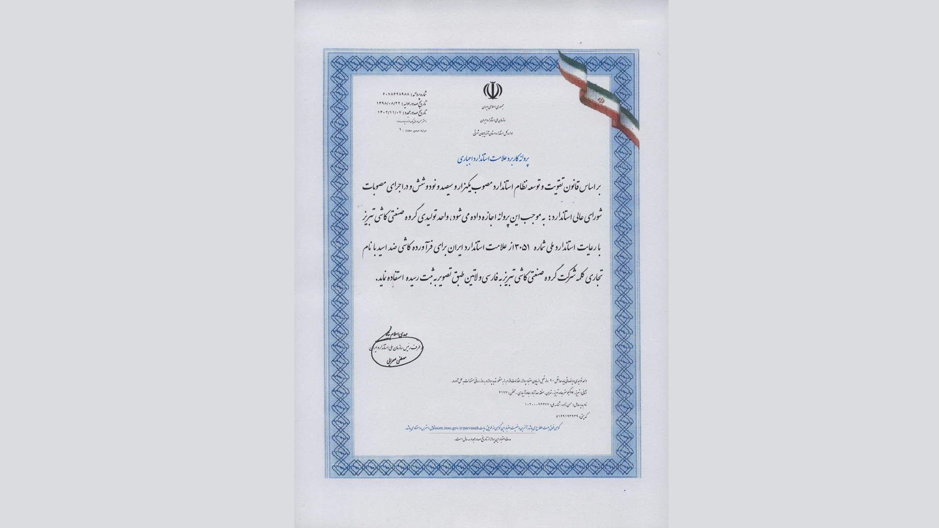 در راستای تکمیل هر چه بیشتر سبد محصولات گروه صنعتی کاشی تبریز، گواهی نامه تولید کاشی ضد اسید از سازمان ملی استاندارد اخذ گردید.