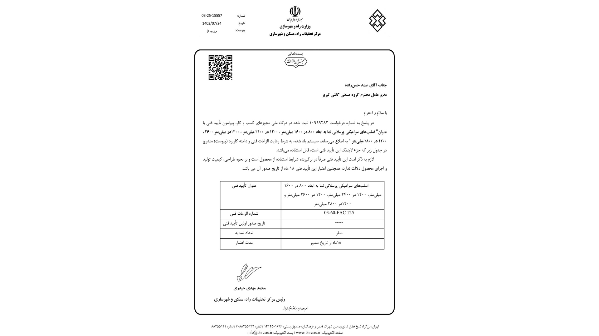 گروه صنعتی کاشی تبریز با هدف پیشرو در نوآوری و تکمیل سبد محصول برای اولین بار در ایران. موفق به اخذ تائیدیه فنی در محصولات سایزهای 160×80 ،240×120 ، 260×120 و 280×120 سانتی متر گردیده است. که به موجب تائیدیه فنی مذکور، علاوه بر کاربری های داخل و خارج ساختمان. مجوز نصب محصولات ذکر شده در نمای خارجی ساختمان به روش خشک (مکانیکی) نیز محقق گردید.